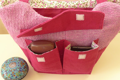 My friend Pauline commissioned a bag in three different colours of pink/purple and the fabric at the bottom of this bag was going to be the bottom part for her bag. However, when I had sewn the front and back panel, I did not like the colour combination and neither did she. It clashed! So I took the bottom part of her bag, combined it with another pink colour, took a pretty floral print for the lining, put two pockets at the front and two slip pockets inside et voila, another bag in pink. Pauline's bag will be the next one to be finished!
